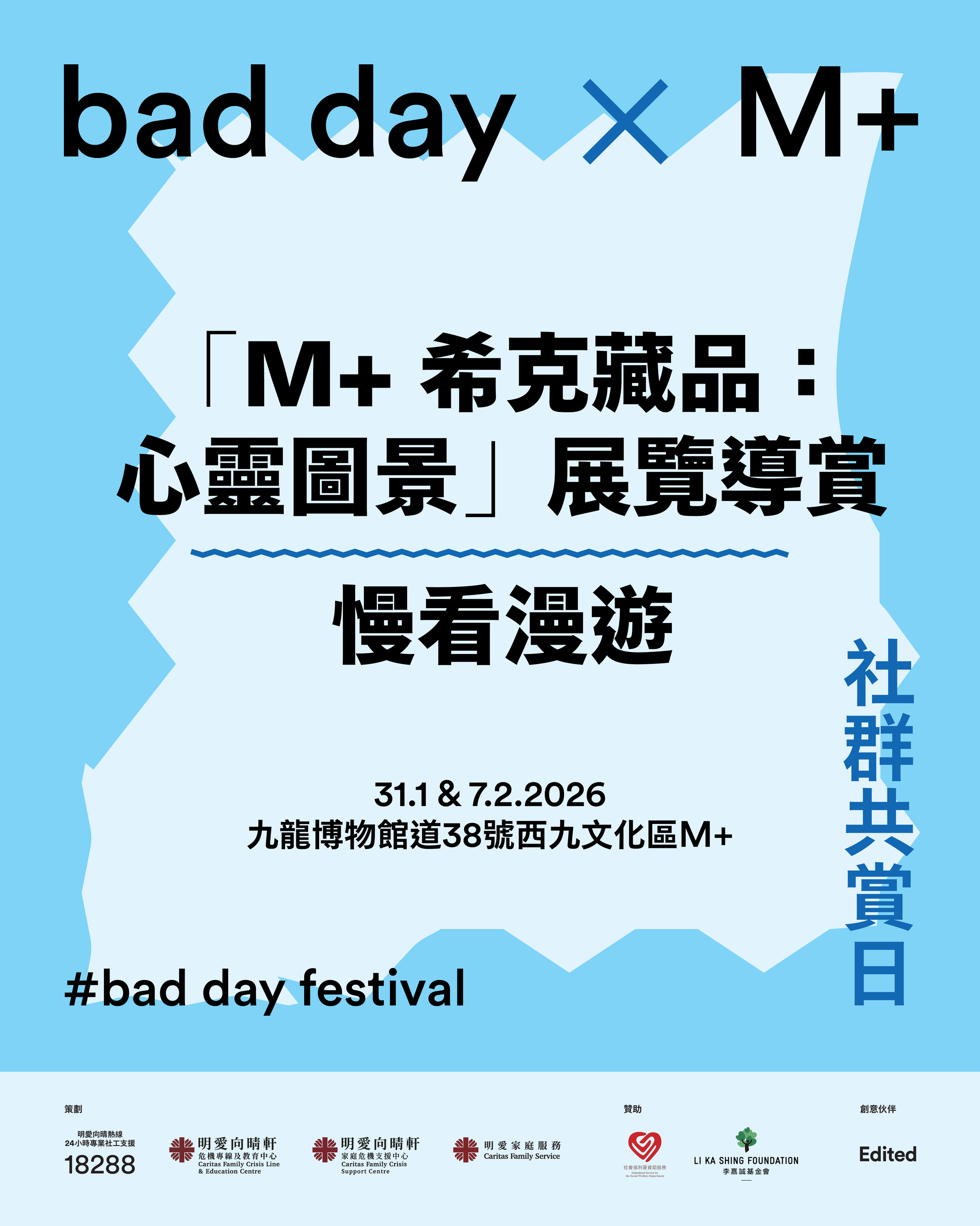 「bad day x M+ 社群共賞日」正是讓你體驗bad day lifestyle的機會。透過引導式工作坊、深入對談和藝術導賞,你將能發掘藝術與心理健康的連結,將藝術轉化為面對 bad day 的內在力量。