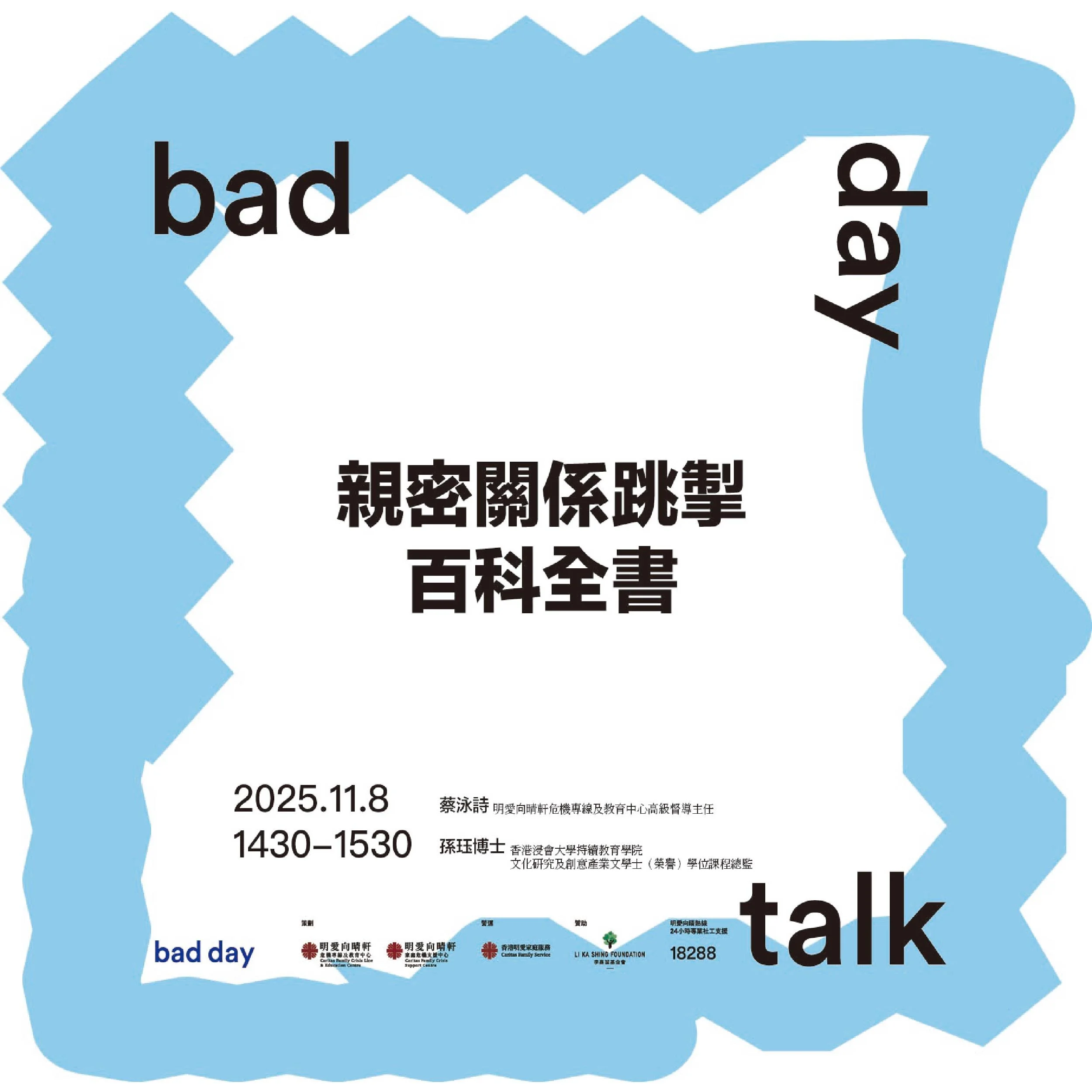 Bad day過後留下來的韌性和智慧,使我們即使活在潮汐起落中,心境仍能澄明如水。是次活動乃明愛向晴軒為慶祝家庭危機支援中心成立20周年、危機專線及教育中心成立15周年而舉辦的專業分享會,希望透過專業工作者的分享與對談,促進業界對危機工作的反思。